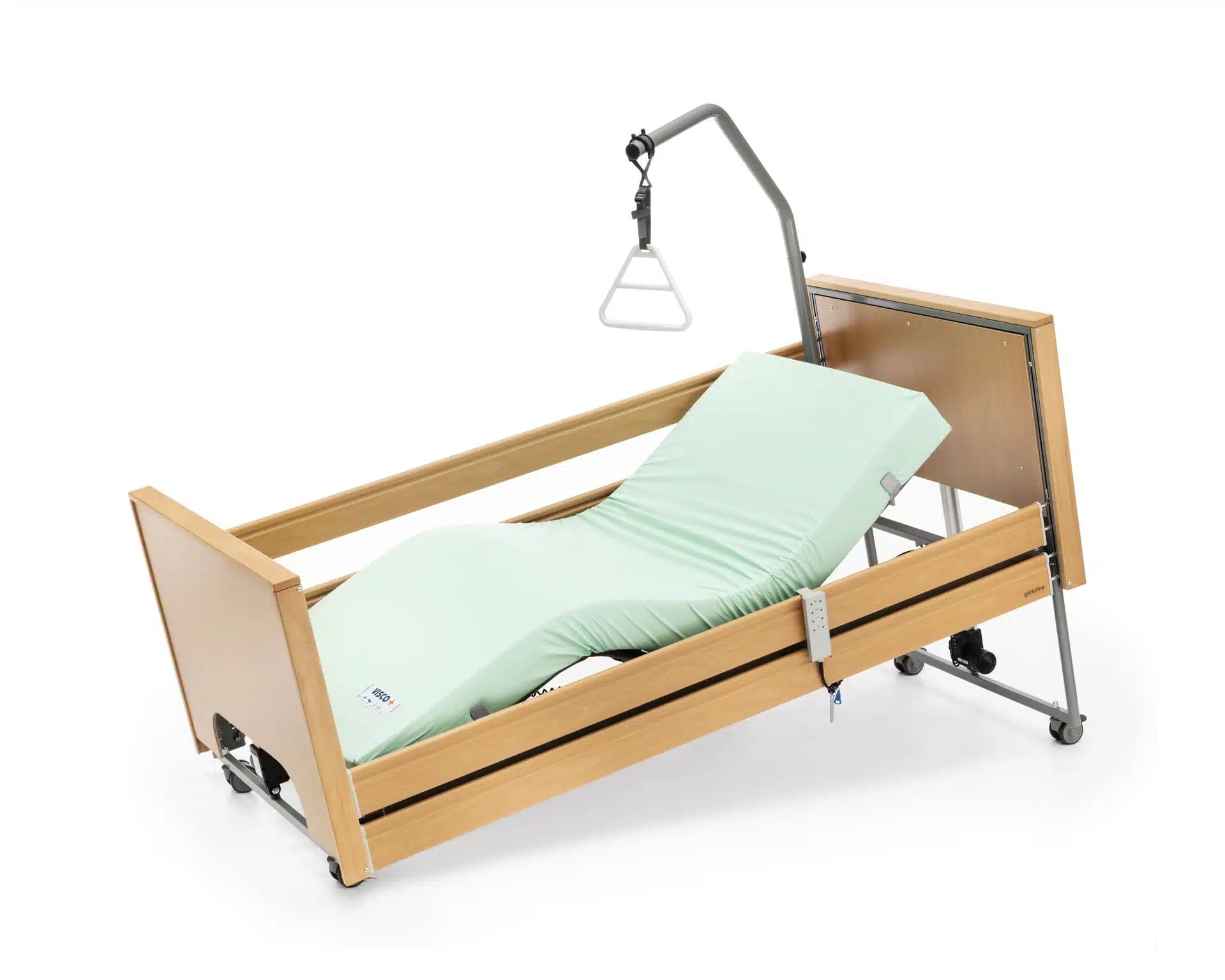 - Compuesto de cama con elevador + cabecero/piecero y barandillas deslizables de madera.